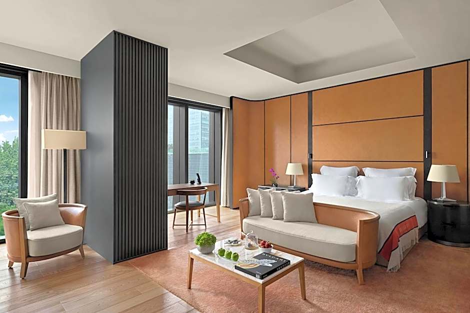 Overlooking Liangma River and Beijing skyline, the deluxe suites unfold in a sequence of ample spaces that include a living room furnished with custom-made elements of Italian design, a separate bedroom featuring a walk-in closet, and a bathroom coated in luminous white Navona travertine with black granite bathtub and shower. Each unit, with their distinctive features and unique individual touch, offers the feeling of a private residence. Size of the suite can vary from 102 to 121 square yards.