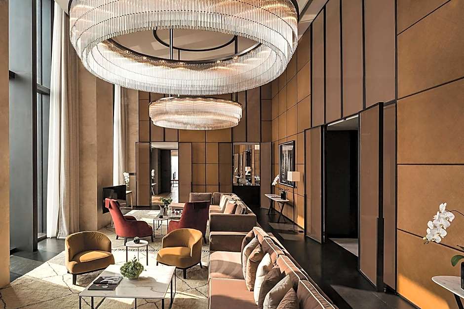 Overlooking Liangma River and Beijing skyline, the deluxe suites unfold in a sequence of ample spaces that include a living room furnished with custom-made elements of Italian design, a separate bedroom featuring a walk-in closet, and a bathroom coated in luminous white Navona travertine with black granite bathtub and shower. Each unit, with their distinctive features and unique individual touch, offers the feeling of a private residence. Size of the suite can vary from 102 to 121 square yards.